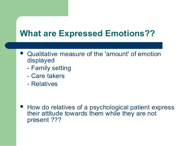 High expressed emotion is more likely to cause a relapse than low expressed emotion Low expressed emotion is when the family members are more reserved with their criticism The family members feel that the patient doesn't have control over the disorder"Expressed emotion" (EE) is considered a marker of dysfunctional family interaction in patients with schizophrenia An alternative hypothesis, however, is that at least some of the different elements of EE really represent attempts on the part of carers to cope with and care for a relative with a psychiatric disorderJun 04, 13 · High expressed emotion (EE) by the caregiver is a warning sign of depressed mood that can signal stresses in the relationship between the care provider and the patient, a